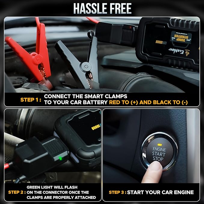 - Safety Meets Versatility: With reverse polarity protection and hassle-free operation, this battery jumper offers secure jump starts every time. Whether used as a cargador de bateria de carro portatil, battery jumper starter portable, or backup jump box, it brings together safety, portability, and performance in one sleek package.