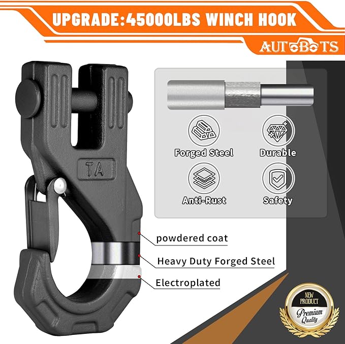 - STRONG WINCH ROPE AND WINCH HOOKS:Our atv winch rope is a very important atv accessory with a maximum breaking strength of 9800lbs and can be installed and used on almost all brands of winches from 1500-5880lbs. It also comes with 3/8" winch hook very durable and sturdy,20ton(45,000lbs)break strength,made from ultra-strong forged steel,our synthetic winch rope hooks are electroplated and sprayed, for better rust and corrosion prevention.