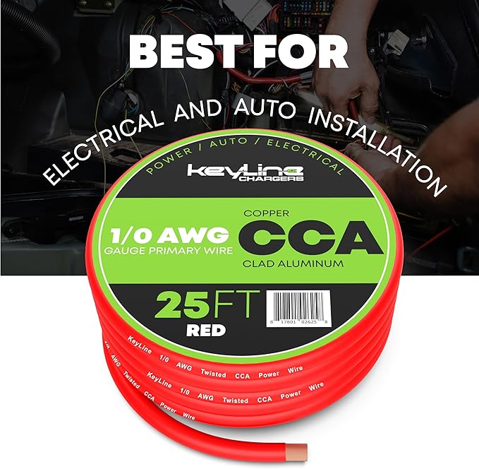 - 1/0 GAUGE 25-FEET RED CCA POWER GROUND WIRE: This top-quality, true 1/0 gauge (AWG) power ground wire is essential for ensuring optimal power transfer in your wiring projects. Remember, a lower gauge number means a thicker cable, reducing resistance to current flow.