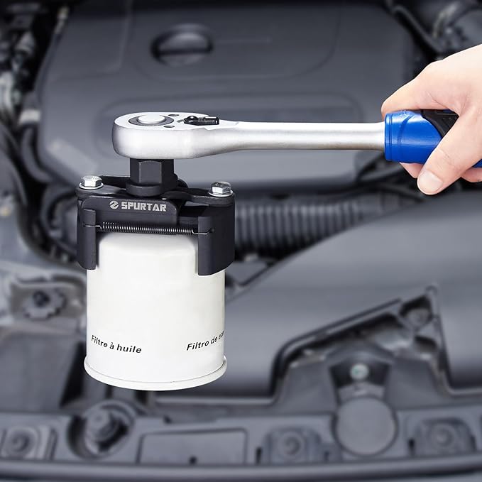 - Application: Spurtar oil filter wrench removes small and medium-sized spin-on oil filters, from 2-3/8 to 3-1/8 inches (60mm-80mm) in diameter. Use a 1/2'' Sq. drive ratchet wrench (not included). Warm Tips: Recommend installing the new oil filter by hand only (Once the gasket on the filter contacts the engine surface, tighten it an additional 3/4 to 1 full turn by hand)