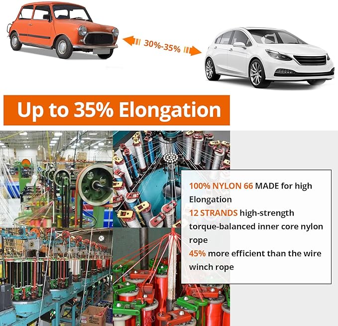 - Premium Material & Higher Elastic Elongation: Crafted from 100% nylon 66 for extended durability.12-strand high-strength torque-balanced nylon inner core provides exceptional resilience and wear resistance, outlasting 8-strand recovery tow ropes. Up to 30%-35% stretch capacity, the ideal choice for safest and smoothest vehicle recovery from mud, sand, or snow, offering impact-free towing that leaves your vehicle unscathed