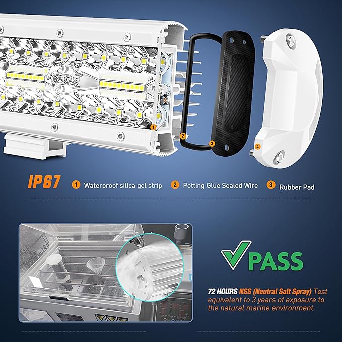 - 【Durable & Waterproof】With solid-build aluminum housing (durable powder coated) and stainless steel mounting bracket and hardware, anti-corrosive, dust-proof, quakeproof, providing great sailing and driving experience. IP67 waterproof, PASS 72-hour laboratory salt spray test, ensures excellent performance even in extreme weather condition like heavy rain, snow, hail, storm, etc
