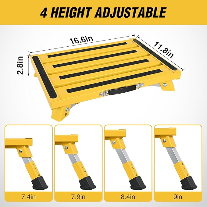 - 4 HEIGHT ADJUSTABLE: The height of the RV step stool can be adjusted to your desired height. Each leg has 4 different height settings: 7.4", 7.9", 8.4", 9". Simply press and hold the buttons on either side to adjust the height. When height adjustment is not required, the stool legs are locked for safety.