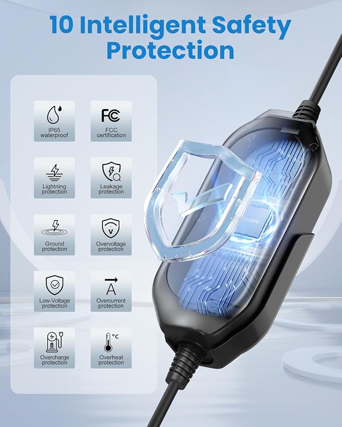 - [Meet Highest Standards for Safety]- Strictly Passed FCC Certification. It offers comprehensive protection against lightning, leakage, grounding, over-voltage, under-voltage, overcharge, over-current, and overheating. Designed with the J1772 standard connector, it is compatible with all-electric vehicles and plug-in hybrids, including Tesla (adapter required).