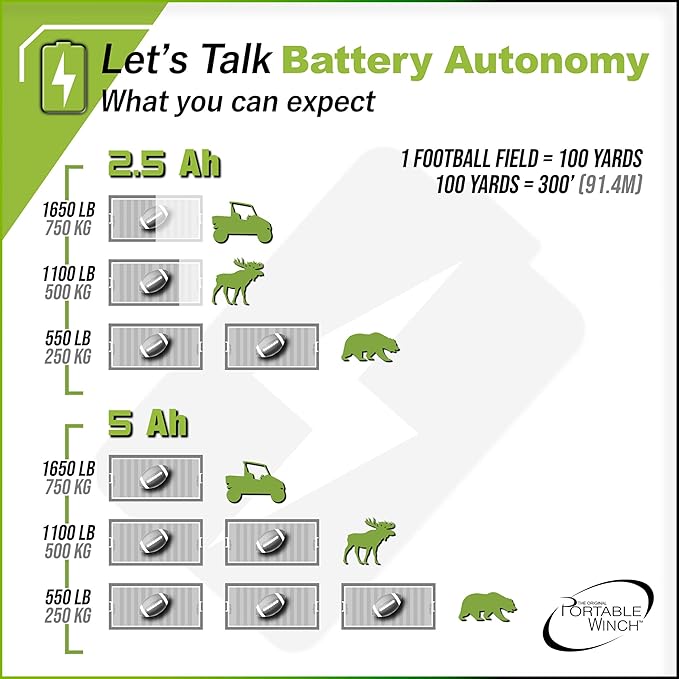 - Battery Autonomy - Since the PCW3000-Li Portable Winch is a battery-powered device, its range and longevity vary based on speed and load weight. For detailed information, please consult our Battery Autonomy diagram.