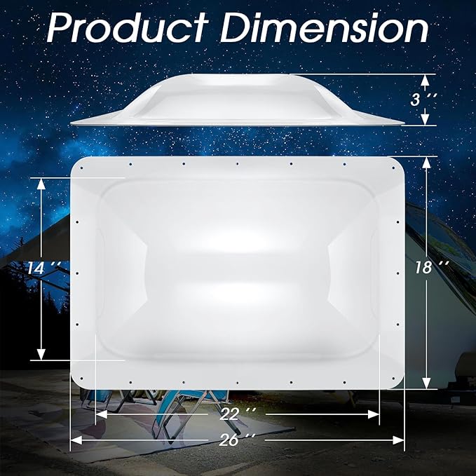 - RV Skylight Replacement: RV Skylight dome opening dimension: 14" x 22" x 4", outer RV skylight cover dimension: 18" x 26", fits all standard 14" x 22" skylight openings of RVs, campers, travel trailers, motorhomes and 5th wheels. The roof flange is large enough to allow a good amount of surface to stands up the wind and storms.