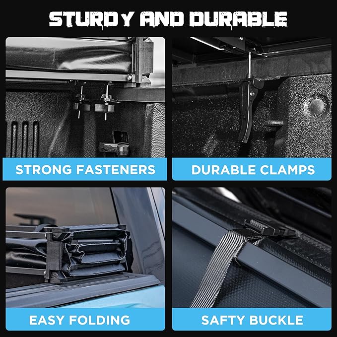- Quadfold Design: Provides more options for adjusting the opening size with its four-section folding design, allowing for partial opening and access to different parts of the truck bed as required.
