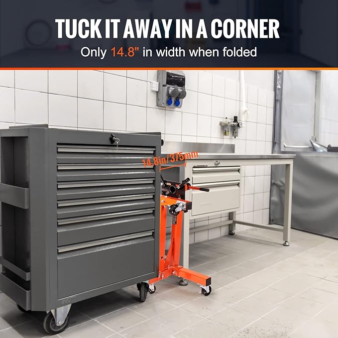 - Space-Saving Design: When not in use, our engine stand conveniently folds to a width of just 14.8" (375 mm), making it perfect for those with limited garage or repair shop storage space. You can easily stow it away in a corner, freeing up valuable floor space for other tools and equipment.
