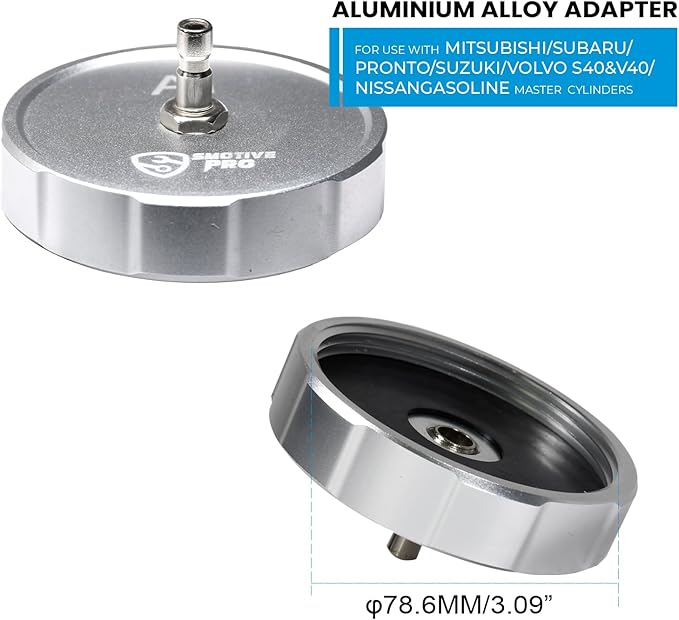 - APPLICATION:This brake bleeder fluid pump comes with an A1 (78.6mm) aluminum master cylinder adapter fitting and is suitable for MITSUBISHI/SUBARU/PRONTO/SUZUKI/VOLVO S40&V40/NISSAN/GASOLINE.The brake fluid change unit can absorb up to three liters of hydraulic fluid and flush the entire system with a single charge, without the risk of the container becoming empty.