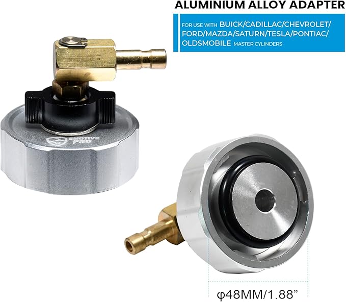 - APPLICATION:This brake bleeder fluid pump comes with an T1 (48mm) aluminum master cylinder adapter fitting and is suitable for BUICK/CADILLAC/CHEVROLET/FORD/MAZDA/SATURN/TESLA/PONTIAC/OLDSMOBILE.The brake fluid change unit can absorb up to three liters of hydraulic fluid and flush the entire system with a single charge, without the risk of the container becoming empty.