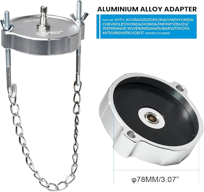 - SPECIFICATION:3L fuel tank capacity with 1L waste oil bottle, Universal (78mm) aluminum master cylinder adapter connector,funnel for injecting liquids and 60cm transparent hose. The brake bleeder kit one person for most brake master cylinder reservoirs,single person can easily perform the operation.