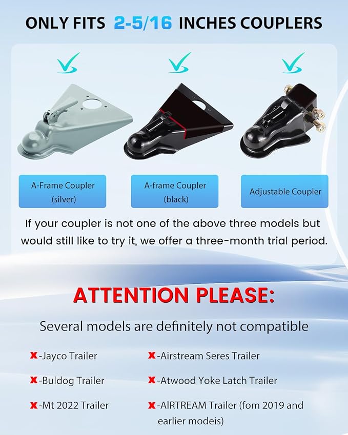 - Compatibility: Our 2 5/16″trailer lock is specially designed for 2-5/16 inch trailer couplers, ensuring a good fit and providing a stable locking effect to prevent theft and accidental detachment.