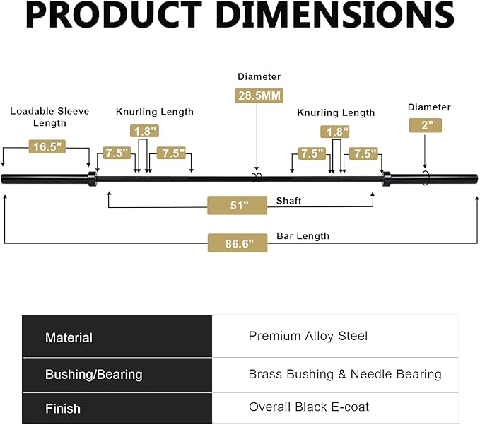 - Pro-Grade Specs: 86.6” length, 20 kg (~44 lb) weight. 28.5mm grip diameter, 51” shaft, and 16.5” sleeves compatible with all Olympic weight plates.