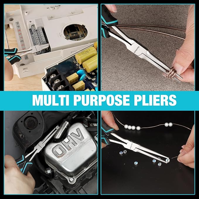 - Versatile Utility: With its combination of long-reach design and compact size, our mini long-reach needle nose pliers are ideal for precise work in confined spaces. Perfect for tasks such as jewelry making, wire bending, small object grasping, electronic assembly or repair, etc.