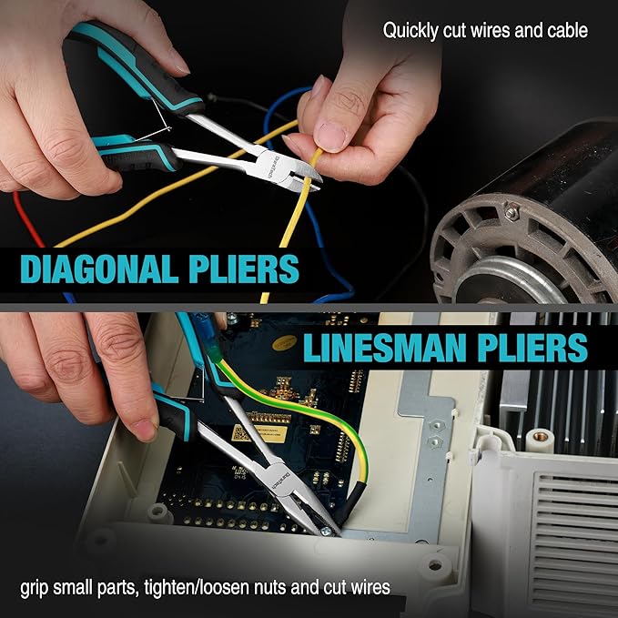 - What You Get: Our mini long reach pliers tool set includes 7" needle nose pliers, 6" linesman pliers, 6" flat nose pliers, and 5.5" diagonal pliers. This plier set also comes with a pouch for easy storage and carrying.