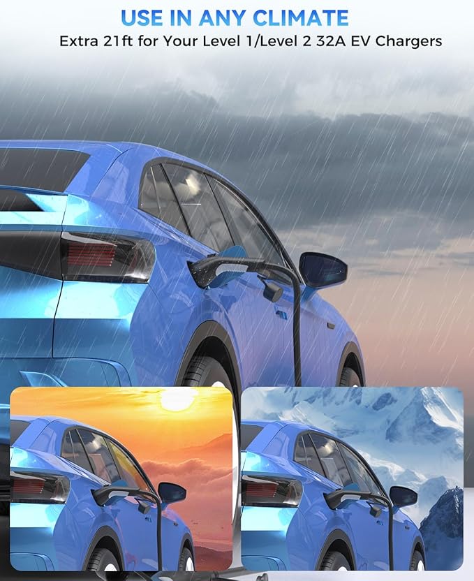 - 【Sturdy EV Charging Cable】Made from high-quality 100% copper TPE, with solid J1772 connectors, this ev charging extension cord is built for durability. Stronger than most, it lasts longer and is IP66 waterproof, making it reliable in any weather