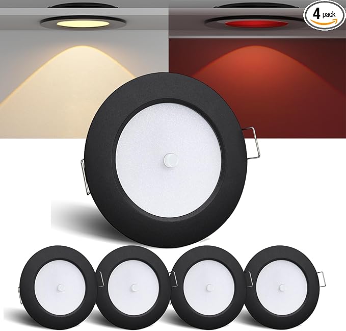 3" LED 12V Push Lights w/Built-in Switch Interior Bi-Color 12 Volt Red LED Puck Light Full Aluminum RV Dimmable Flush Mount Light for Camper, Boat, Trailer 4Pcs (Black, Warm White)