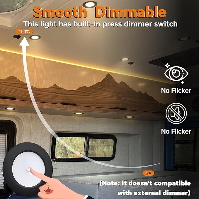 - Integral Tactile Push Button & Dual Color: This 12V Puck Light has inbuilt Tactile Push Button dimmer for on/off and stepless dimming control, plus the red light preserves night vision in dark night.