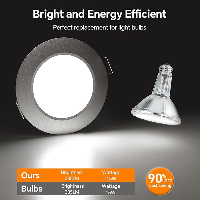 - Shock-proof Flush Mounting: Installation is easy and fast, drill a 2-1/2" cutout, 2 stainless spring clamp firmly fix the light to ceiling or under cabinet, very sturdy and vibration-proof