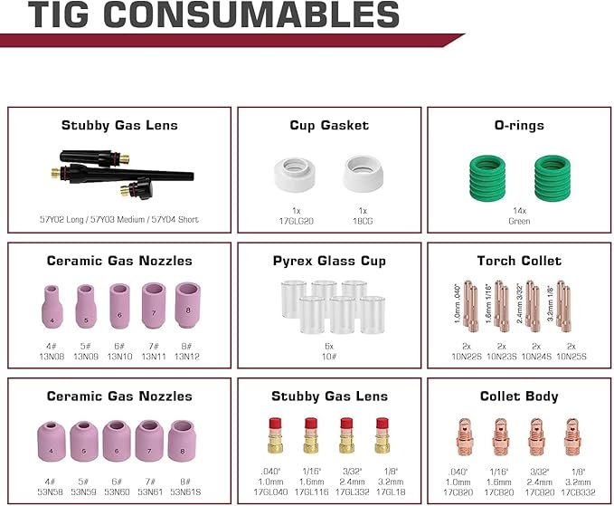 - Complete TIG Torch Kit - 49pcs Tig Welding Torch accessories (consumables) kit. This set includes all the essential TIG torch accessories and consumables, so you can get started on your welding projects right away.