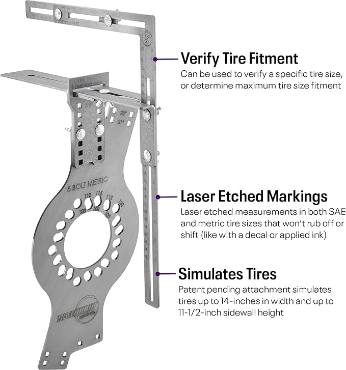 - Simulates Precise Tire Fitment: The WheelWise 5-lug tire fitment tool attachment accurately simulates tires up to 14 inches wide and with sidewalls up to 11.5 inches, allowing you to verify or determine the maximum tire size for your vehicle.