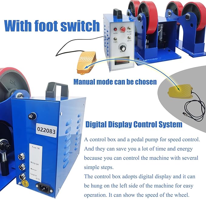- 【Easy to Operate】The welding turning roll can be easily controlled by the hand control box. A control box and a pedal pump for speed control. And they can save you a lot of time and energy because you can control the machine with several easy steps. The control box is digital display and it can be hung on the left side of the machine for easy operation. It can show the speed of the wheel