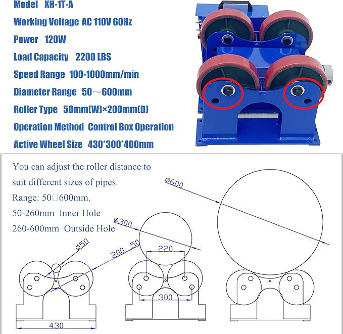- 【Parameter】Working Voltage: AC 110V 60Hz; Power: 120W; Load Capacity: 2200 LBS; Speed Range: 100-1000mm/min; Diameter Range: 50~600mm; Roller Type: 50mm(W)×200mm(D); Operation Method: Control Box Operation; Active Wheel Size: 430*300*400mm