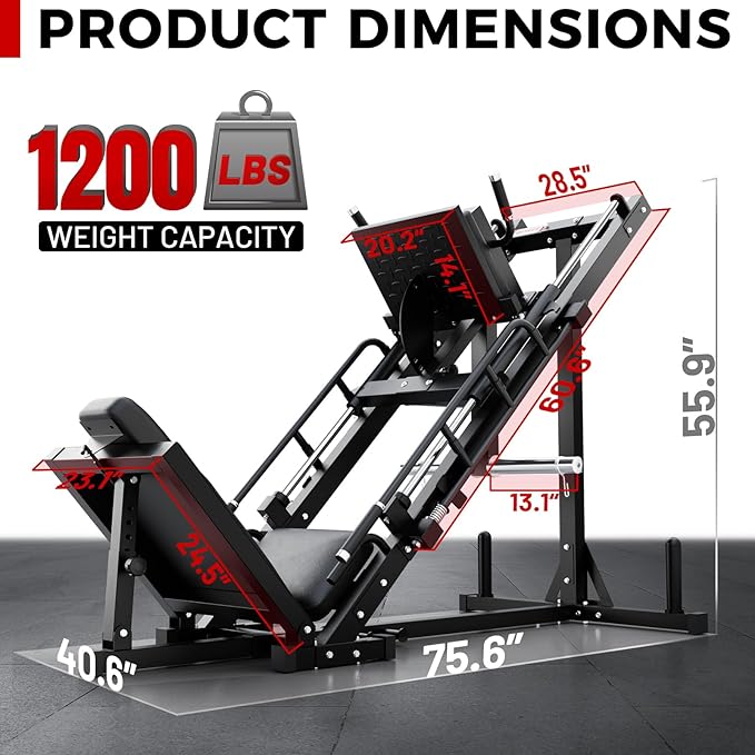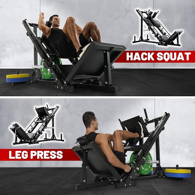 - 【Stability & Versatile Workout】This two-in-one leg press and hack squat machine is adapted linear bearings rather than rolling ones, and it is constructed of heavy-duty high tensile beefy steel. Beyond that, there are two weight plate storage holders at the rear bottom, when stacked up, greatly enhance machine's stability when in motion. By adjusting the placement of your feet on the foot plate, you can focus more on training isolating muscle groups.