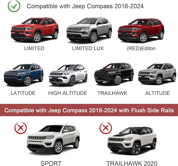 - 【Excellent fit】These roof rack crossbars are designed specifically fit for Jeep Compass 2018 2019 2020 2021 2022 2023 2024 2025 WITH SIDE ROOF RAILS.(Note:Not for SPORT & 2020 TRAILHAWK)Please make sure it fits your vehicle before purchasing.