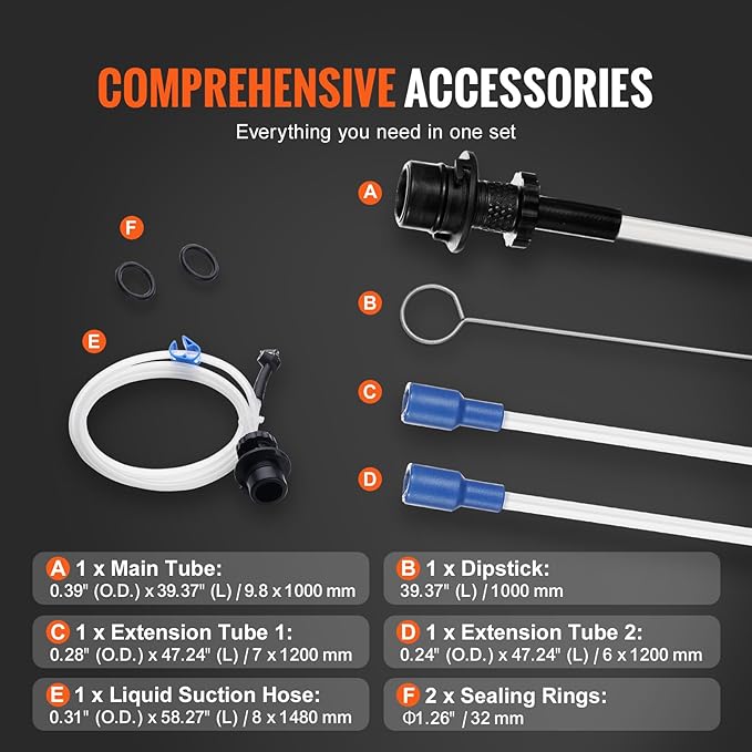 - Thorough Fluid Extraction: 15L vacuum fluid extractor comes with four sizes of suck-it-all-up oil extractor tubes, you're reaching the deepest depths, leaving tanks dry. Main Tube: 9.8" x 39.37" / 249 x 1000 mm; Extension Tube 1: 0.28" x 47.24" / 7 x 1200 mm; Extension Tube 2: 0.24" x 47.24" / 6 x 1200 mm; Suction Hose: 0.31" x 58.27" / 8 x 1480 mm.