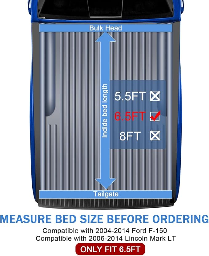 - [VEHICLE MODEL FIT] Compatible with 2004-2014 Ford F-150 6.5FT Bed, compatible with 2006-2014 Lincoln Mark LT 6.5FT Bed. Please verify your bed length before ordering.