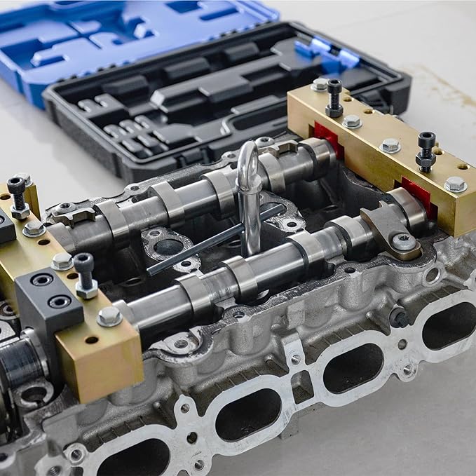 - 【High-Precision Design】The camshaft timing tool kit is used to loosen and tighten the bolt connection of the camshaft gear. It adopts a high-precision design, the size and diameter of the retaining clip ensure that the camshaft is correctly fixed in place, and the camshaft can be easily disassembled and assembled.