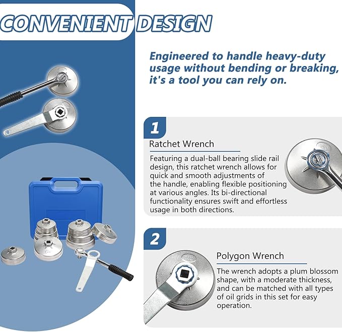 - 【Premium Materials】Crafted from a blend of durable stainless steel and aluminum alloy, our Oil Filter Wrench Set ensures exceptional strength, resistance to rust, and longevity. Engineered to handle heavy-duty usage without bending or breaking, it's a tool you can rely on.