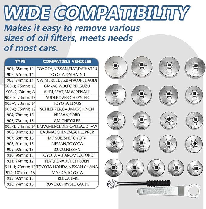- 【Wide Application】Included in the package are a 1/2” square oil filter wrench socket tool with right/left adjustment, a ring spanner, and 21 oil filter cups ranging in sizes from 65mm-14 to 101mm-15. Makes it easy to remove various sizes of oil filters, meets needs of most cars.