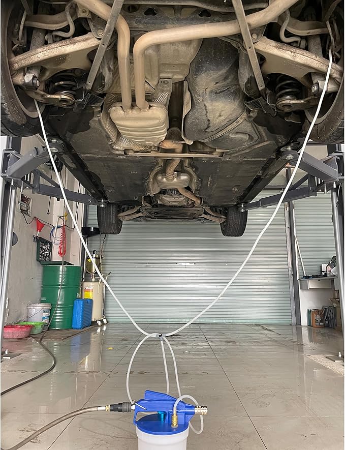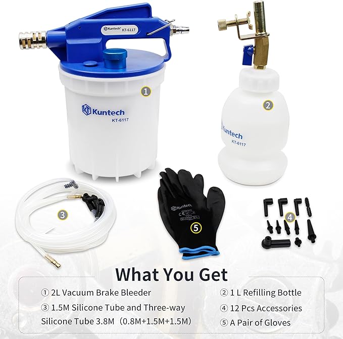 - 【What's Included】The pneumatic vacuum bleeder tool kit includes a 2 Liter fluid reservoir, 1 L refilling bottle, 60-inch silicone hose, three-way silicone hose 150-inch(30-inch+60-inch+60-inch)and 12 pcs adapters. It is designed to fit most vehicle brake oil bleeder fittings and is used with most standard and ABS brake systems.