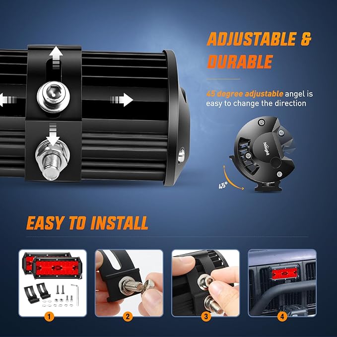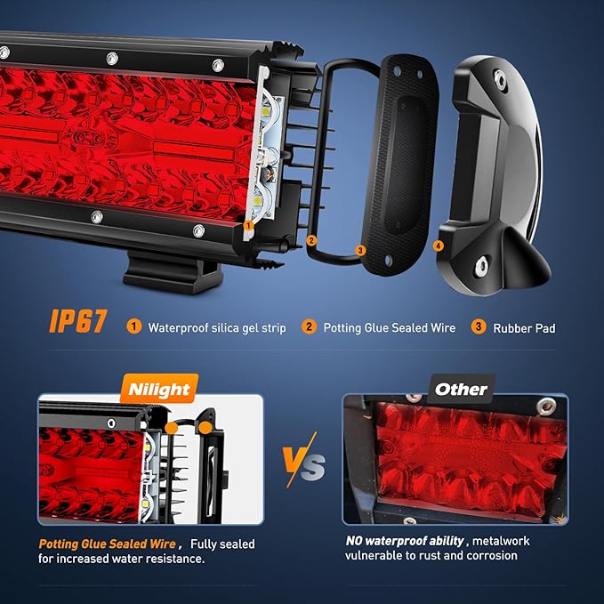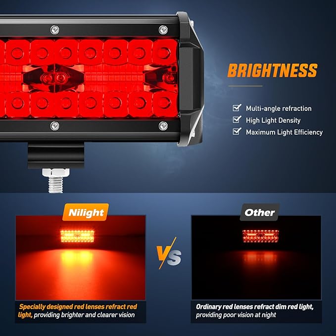 - Red Super Bright combo beam: Adopted 40pcs 3w led chips, appropriate combination of spot beam and flood beam for wide spread and further distance illumination, allowing you to see the front and rear cars clearly in bad weather such as night or heavy fog, light up your night fishing, night ride or any other night activities