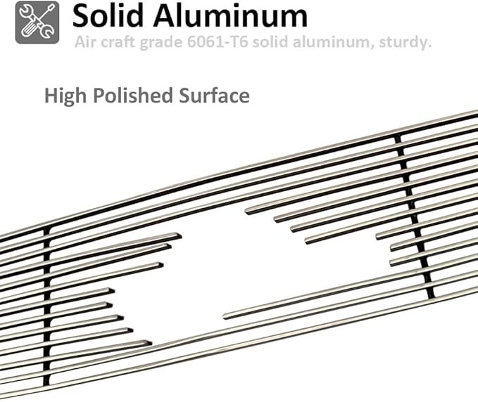 - 【SOLID ALUMINUM】Front upper billet grille insert is made of air craft grade solid aluminum and customized to fit the front bumper of your vehicle. All necessary hardware and instruction are included. Grille insert only, logo or emblem, frame or shell is NOT included.
