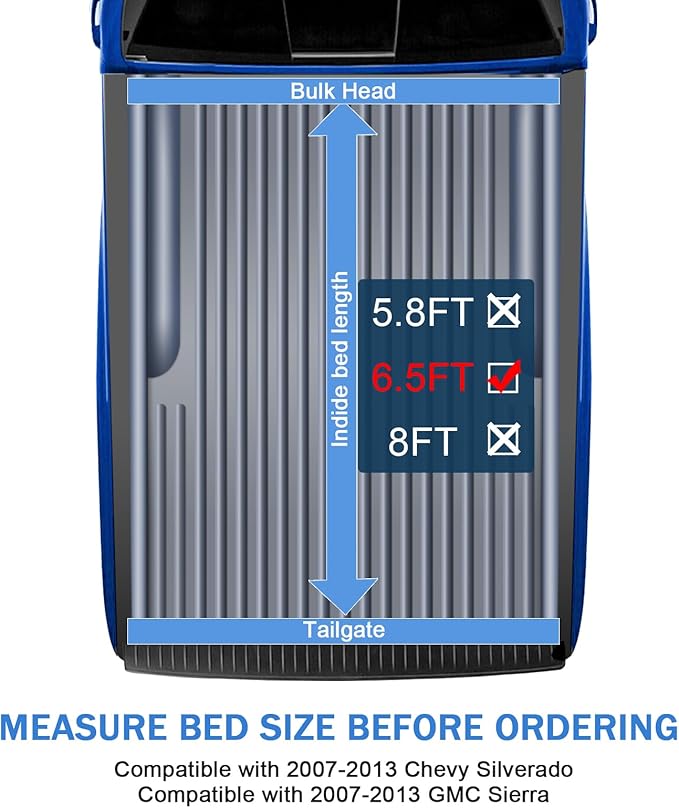 - [VEHICLE MODEL FIT] Compatible with 2007-2013 Chevy Silverado 6.5FT Bed, compatible with 2007-2013 GMC Sierra 6.5FT Bed. Please verify your bed length before ordering.