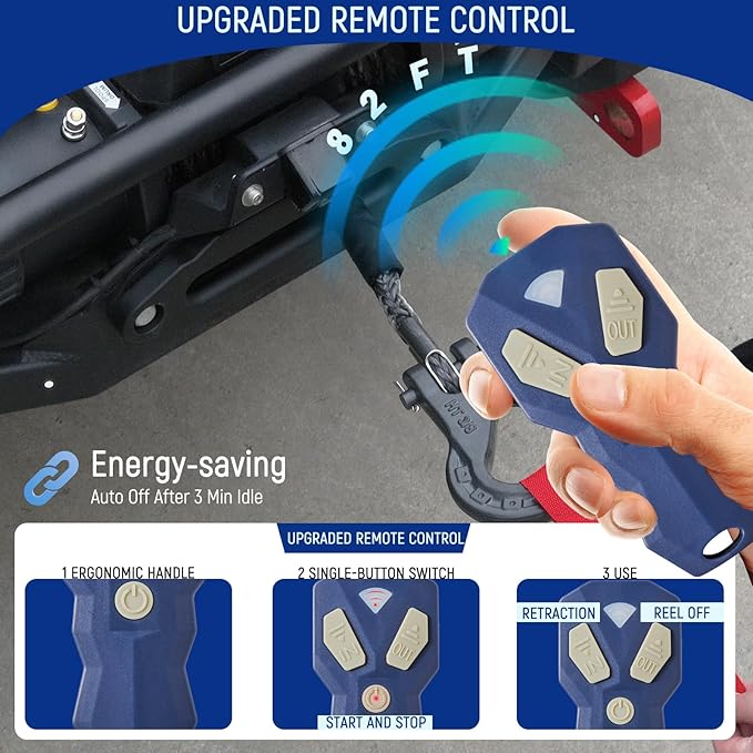 - Equipped with high precision miniature digital wireless remote control, breaking through the limitation of terrain and weather, and is very convenient to use; The winch remote control range is greatly expanded 82ft