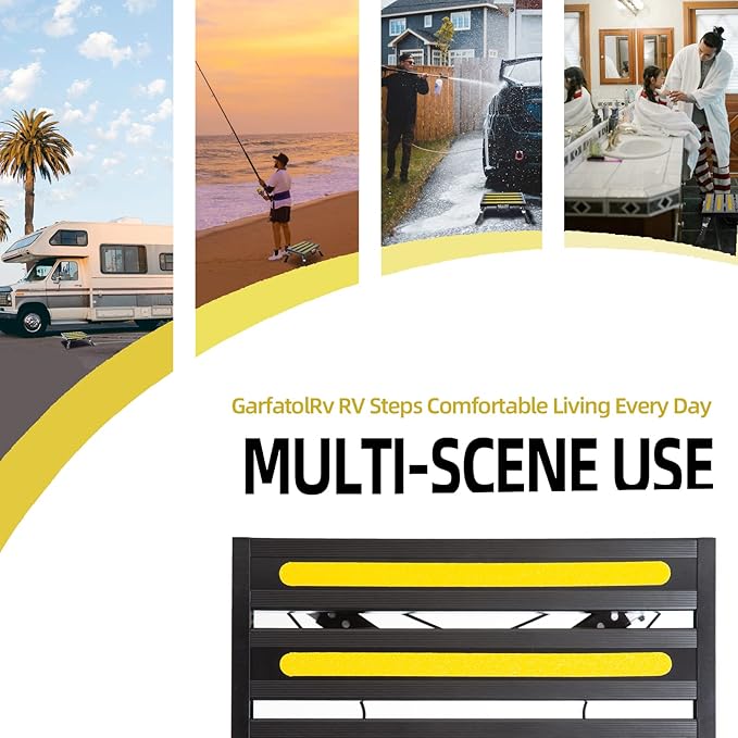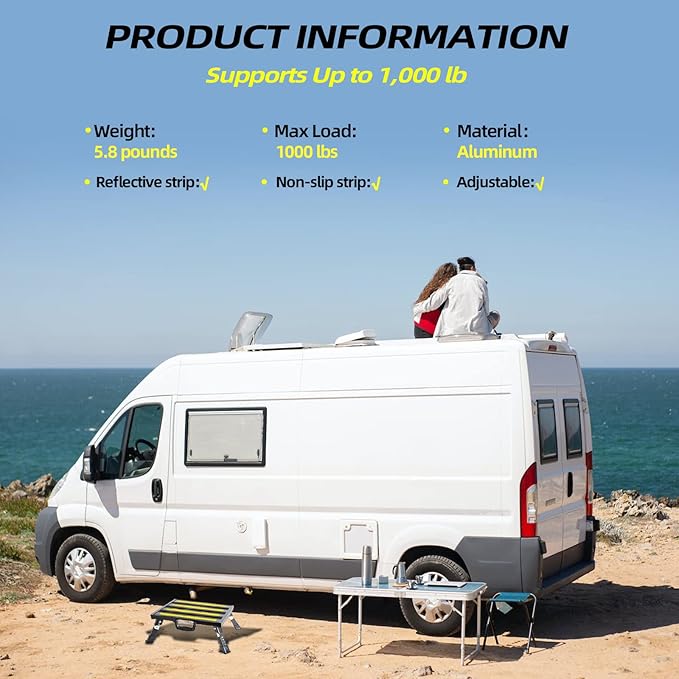 - Outstanding Anti-slip Performance: Safety is paramount, which is why our RV step boasts an anti-slip design.The platform adopts anti-slip strips and legs cover anti-slip rubber, which maximizes stability and support and minimizes the risk of slips or accidents. Specially designed fluorescent light strip enhances visibility during nighttime use, ensuring a safe use experience at all times