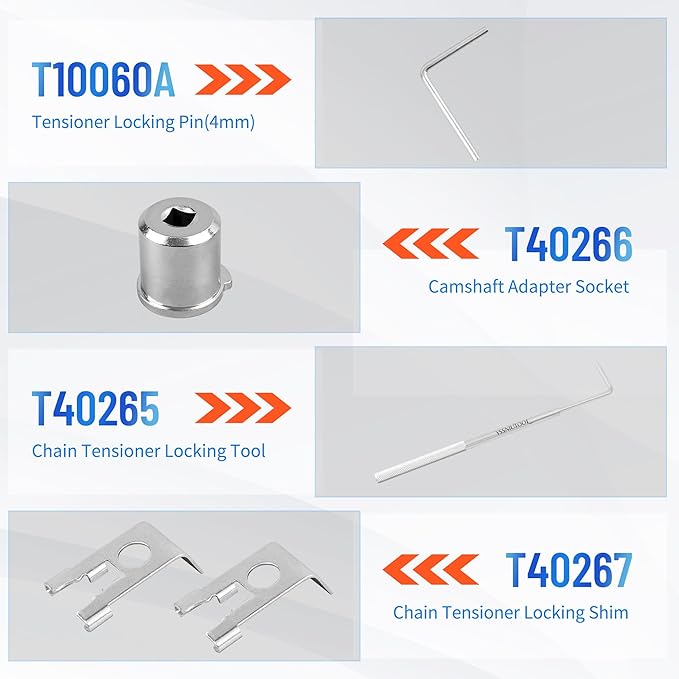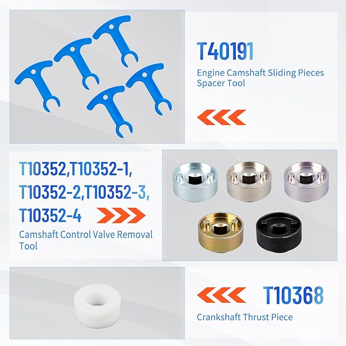 - Engine camshaft locking tool Compared with similar products, this new kit includes more comprehensive tools, such as Camshaft slide positioning, etc. The 30-piece set is equivalent to OEM T10352/2 T10352/1 T10352 T10368 T40196 T40011 T10354 T40267 T40271 T40098 T10355 T10170 VAS6079.