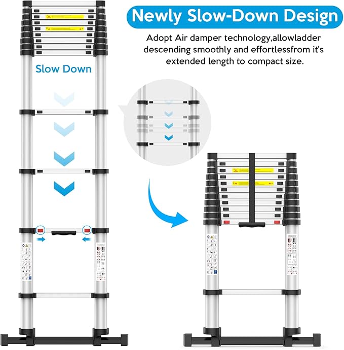 - Anti-Pinch Slow Descent Design: Our collapsible ladder incorporates an innovative anti-pinch slow descent feature that ensures that the ladder retracts slowly and smoothly, preventing the risk of pinched fingers or hands.