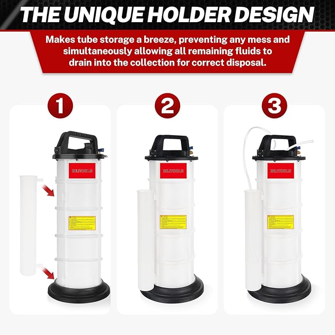 - Mess-Free Storage Tube: Comes with a dedicated storage tube holder that keeps hoses neatly organized, preventing spills and maintaining a clean workspace. This feature ensures all residual fluids are properly collected for safe disposal.