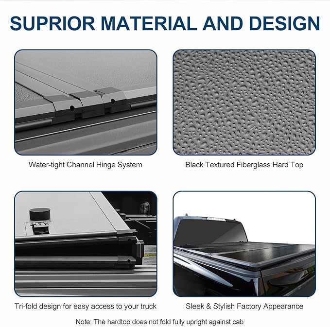 - 1.Stylish and Protective Design: With a matte-black finish and heavy-duty FRP top panels, the cover offers advanced impact-resistant construction and a weight rating of up to 500 lbs. of evenly distributed weight. This makes the hard-folding tonneau cover a sturdy and protective product engineered with aesthetics and functionality in mind, ensuring a durable product that can handle whatever is thrown its way.