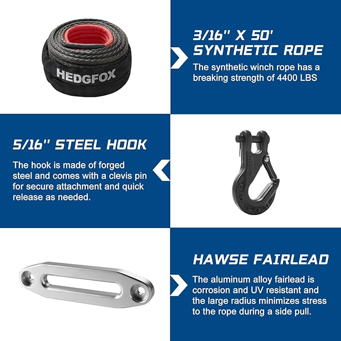 - Waterproof IP65 powder coated surface for corrosion resistance, could be used even on extremly weather normally, with 3/16 inch x 50 feet synthetic winch rope