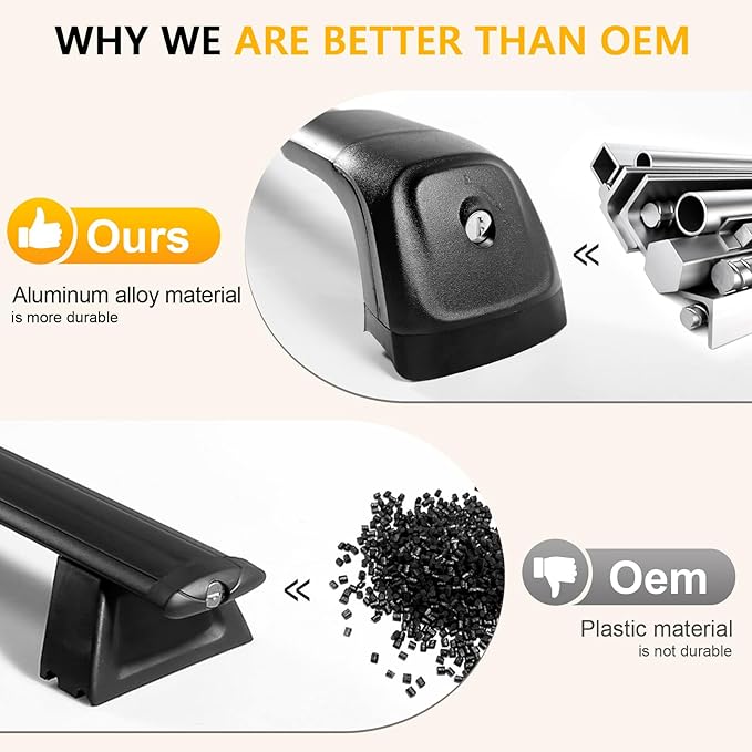 - 【Better Base Feet】Base feet are made from high grade aluminum which add to extra security and durability, better than most in the market made from plastic. High-grade aluminum alloy crossbars can support luggage, ladder or cargo,roof rails can support a weight of 260 lbs (118kg).