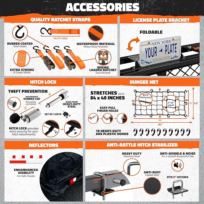 - SECURE OFF-ROAD CARGO TRAILER RACK: Tackle any terrain with our vehicle cargo baskets , built with a raised shank rise for superior ground clearance. This universal 2" receiver hitch cargo carrier fits most vehicles & comes with a hitch stabilizer & lock set for a rattle-free, secure cargo hitch basket . A built-in license plate bracket & reflectors provide the hitch cargo rack enhanced visibility, making this folding hitch cargo carrier a safe, reliable hauling option for wherever you want go.