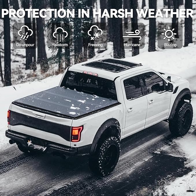 - Element-Proof Cargo Cover: Crafted with high-quality Fiberglass Reinforced Polymer (FRP) sheet, our truck bed tonneau cover offers excellent scratch resistance and protection against different weather elements including rain, snow, dirt, and UV rays. Enjoy reliable durability without fading, cracking, or peeling