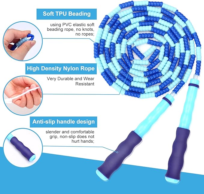 - Good Choice for Fitness:This beaded jump rope is suitable for beginners, outdoor and indoor activities, fitness enthusiasts, trainers, skipping ropes, lightweight and easy to carry; bright colored beads make your jump ropes unique.