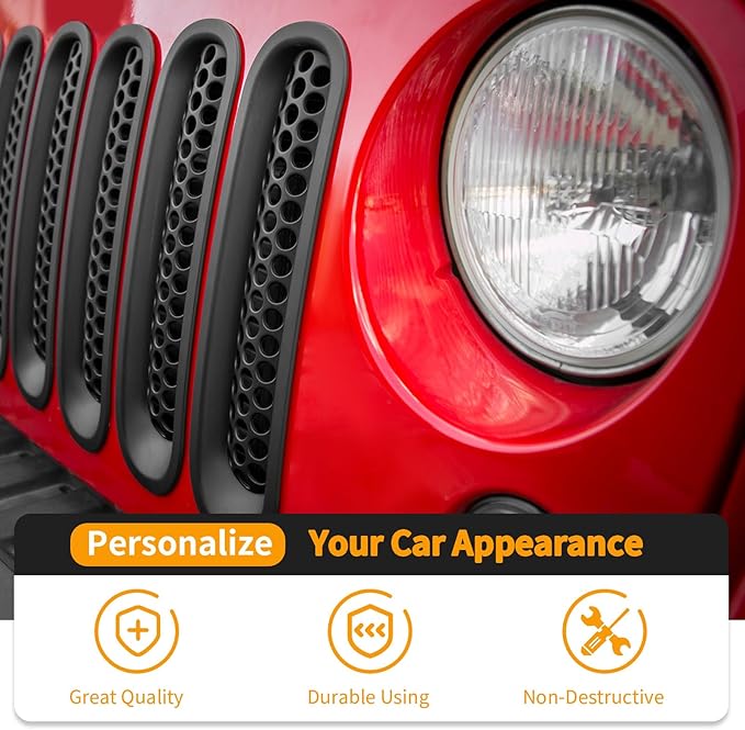 - Function-- The honeycomb grill insert cover for Jeep Wrangler can change your car current look and add a stylish touch with no modification required. Protects from road debris while allowing air to pass through to cool the engine compartment and prevent overheating.